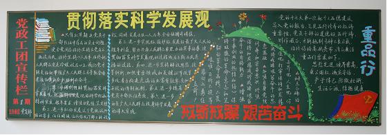 福建师大文博附中党支部在学校“党政工团宣传栏”出版一期题为“贯彻落实科学发展观”的宣传板报。提出,只有抓紧解决党员干部队伍中存在的问题,使全党同志始终坚持立党为公、执政为民,才能带领广大人民为夺取全面建设小康社会的胜利而努力奋斗。同时也指出广大党员同志要戒骄戒躁,艰苦奋斗,重视自我的品行建设,要做到:思想先进、境界崇高、秉公用权、诚实守信、严于律己、防微杜渐、生活正派、情趣健康。