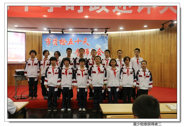 2014年11月24日,初一年段在会议中心一楼,召开期中考表彰大会及“四星级星少”授勋仪式,整个过程隆重而热烈。俞校长,周校长,教务处余光亮主任、吴勉玉副主任,德育处林叔飚主任,事务处杨为劭主任全程参与,为获奖学生颁奖。