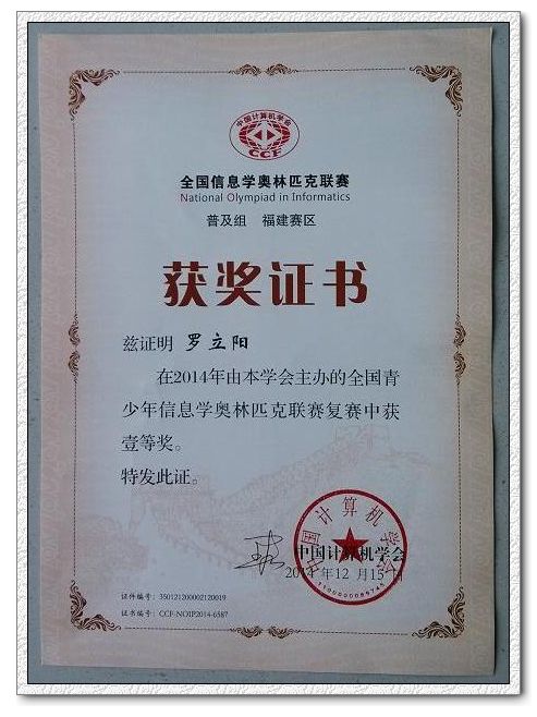 我校初三2班罗立阳同学于11月8日参加了在福州高级中学举行的第二十届全国青少年信息学奥林匹克联赛(简称NOIP2014)复赛(省赛),荣获省一等奖,指导老师:赵燃。