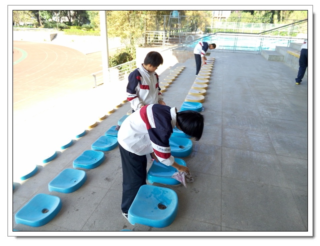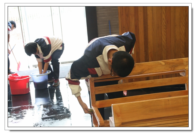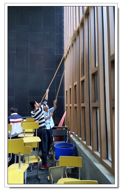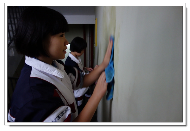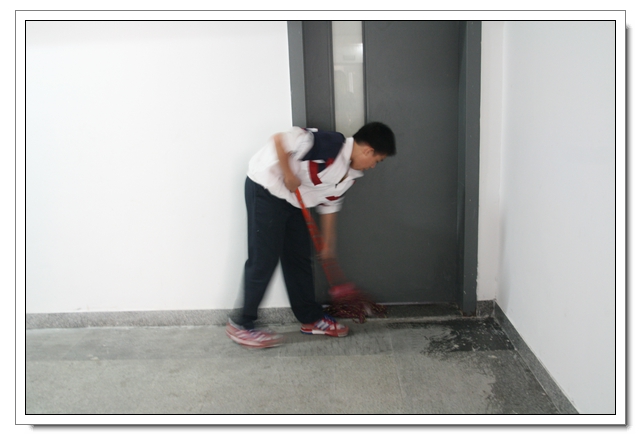 第三,各班在实践活动前由班主任明确实践范围,宏观分组,强调注意事项;而后由组长带领每小组成员去包干区域,紧接着由小组长分配任务,各小组成员分工合作,有的清理天花板,有的擦洗楼梯、墙体及玻璃,有的剔除地面口香糖,有的清除杂草、杂物……每个同学都以万分饱满的姿态、积极认真参与到实践活动当中。同学们团结协作,不怕苦不怕累,所到之处的面貌焕然一新。最后,同学们在收获劳动的快乐中做好收尾工作并由各班班主任在班级教室集中进行汇报总结。