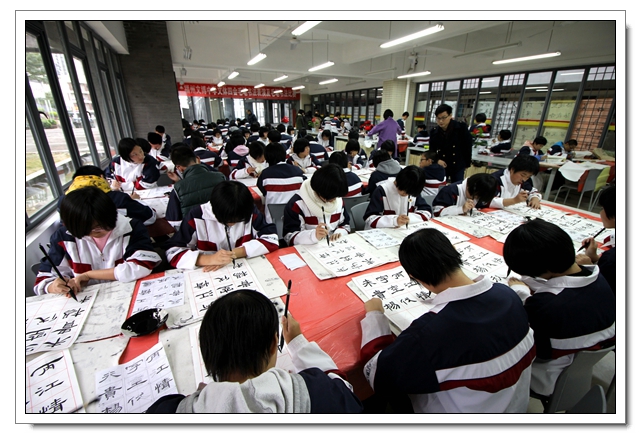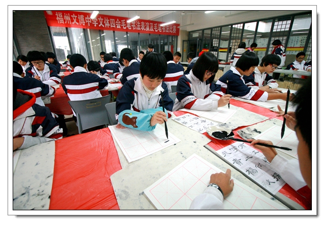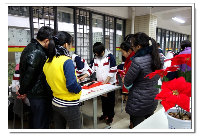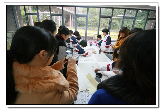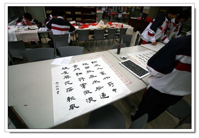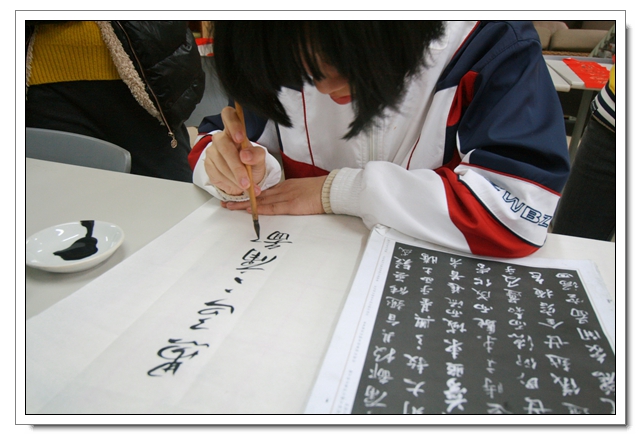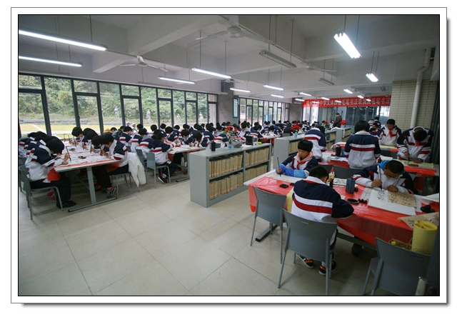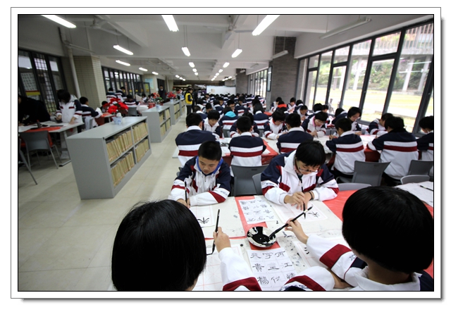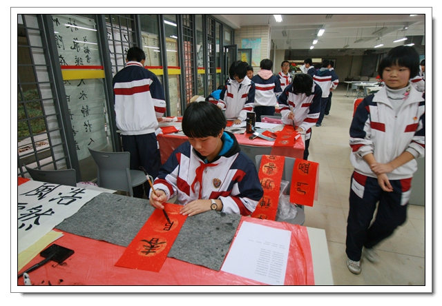 2014年12月26日下午,我校迎新春现场书法比赛暨文体四会书法考核在一楼阅览室隆重举行,本次活动有初二年级100人参加了文体四会的书法表演,30人参加了现场书法比赛,场面隆重而有序,初二的同学展示了这半学期以来的书法教学成果,参赛的同学表现了自己最高的水平,比赛结束同学们又踊跃地参加了写春联迎新春的活动,本次活动取得了圆满的成功,特别感谢学校领导的支持和各位老师同学的参与。