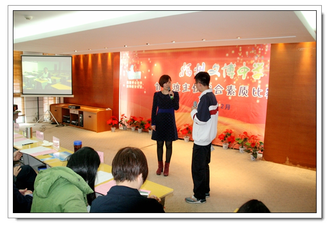 自2014年12月1日下午班主任例会的参赛报名动员开始,至2015年3月23日下午举办的“才艺展示”比赛活动结束,历时近四个月,有20位班主任或年段长参加了以“展现专业素养,演绎教育智慧”为主题的“福州文博中学首届班主任素质大赛”,终于落下帷幕,圆满完成各项赛事。