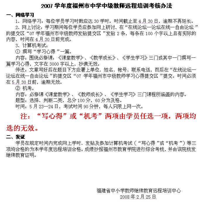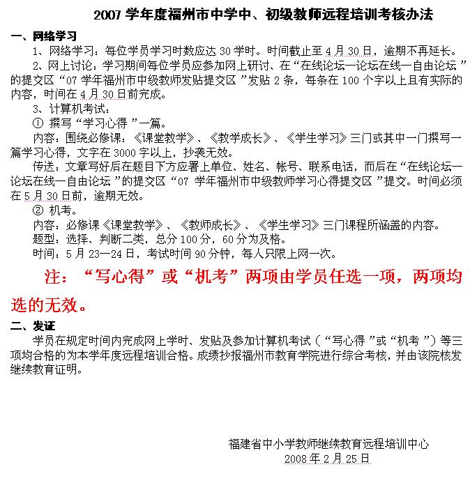 2007学年度福州市中学中级教师远程培训考核办法