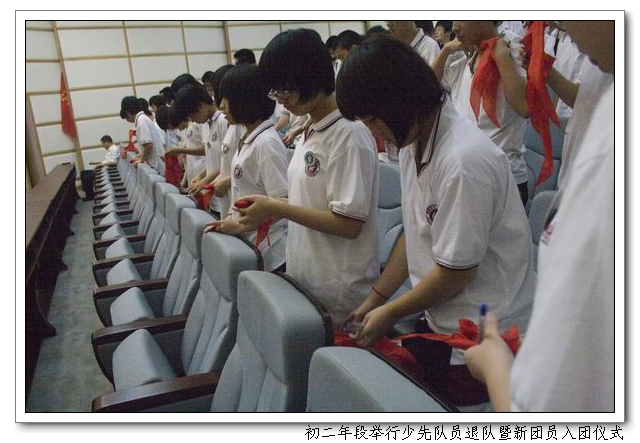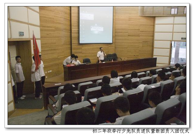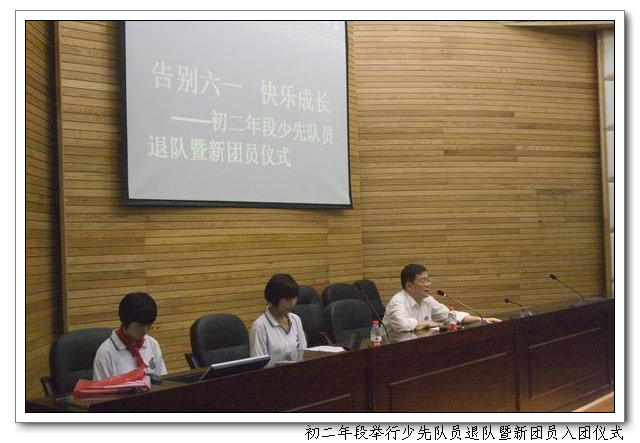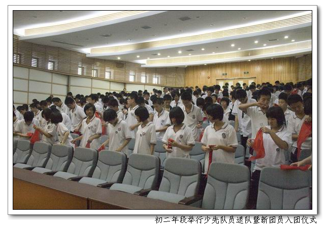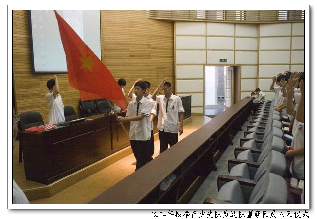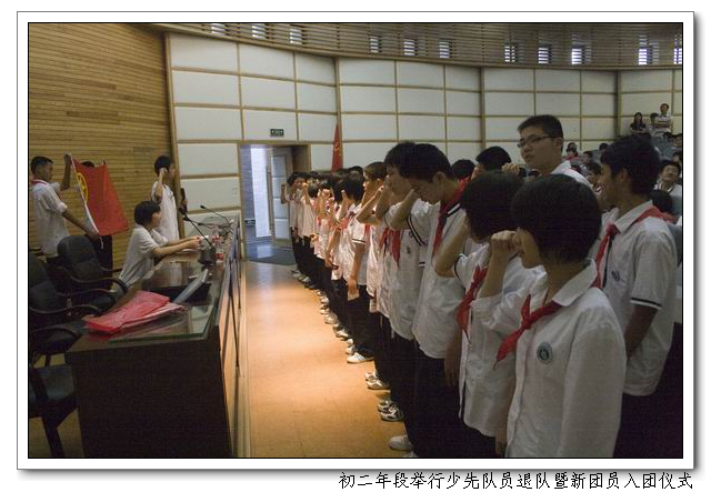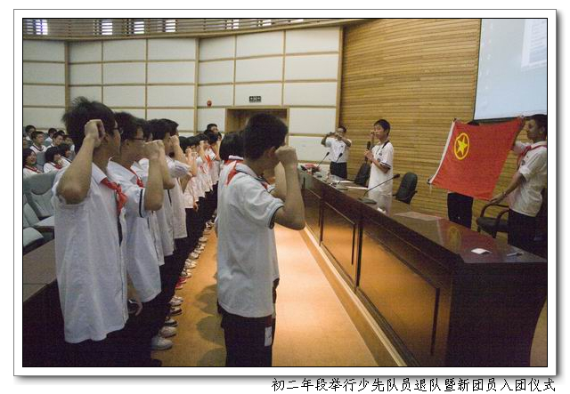 5月31日我校初二年段顺利举行《告别六一,快乐成长》——少先队员退队暨新团员入团仪式。随着大队长陈齐民一声令下同学们将伴随了多年的红领巾纷纷摘下,34位新团员在本次活动中进行了庄严的的入团宣誓!活动中俞校长给同学们提了三点要求,要求同学们做到:争取进步,对己负责,守信诚实!