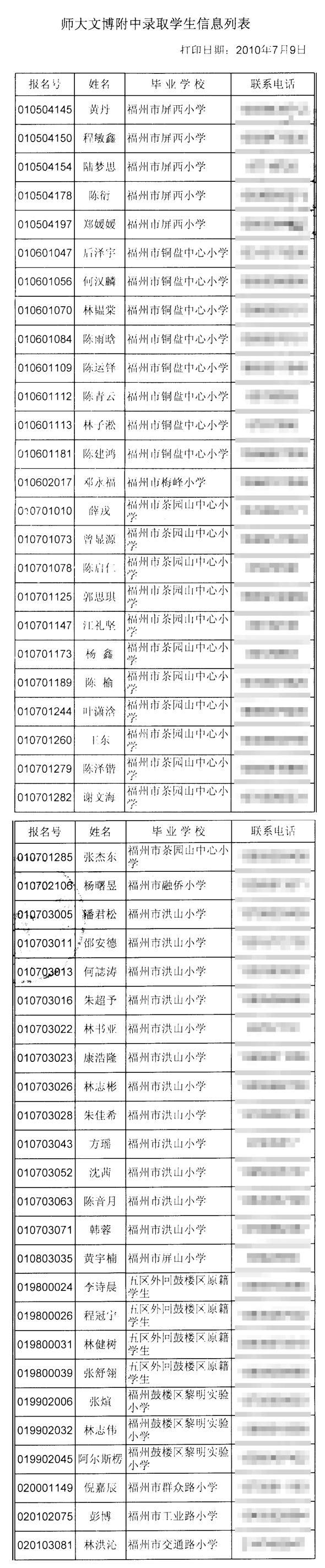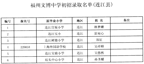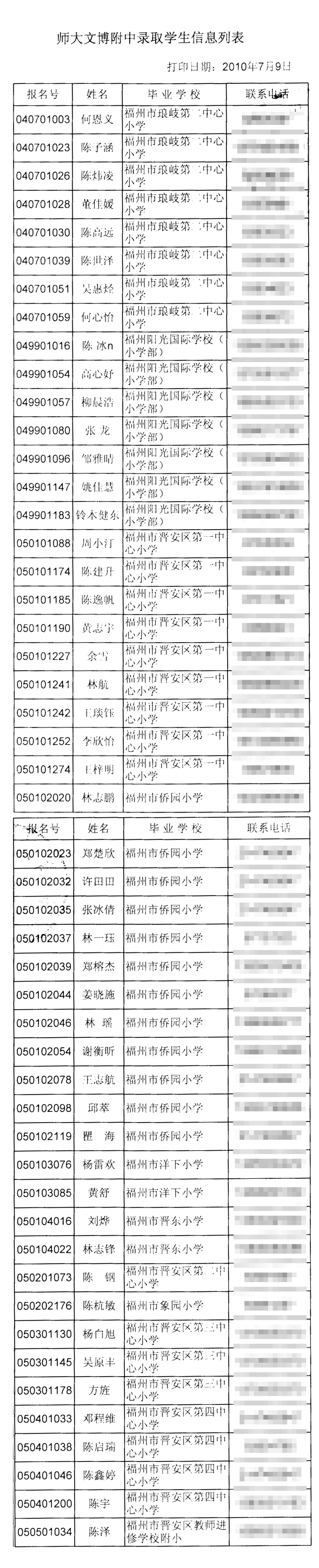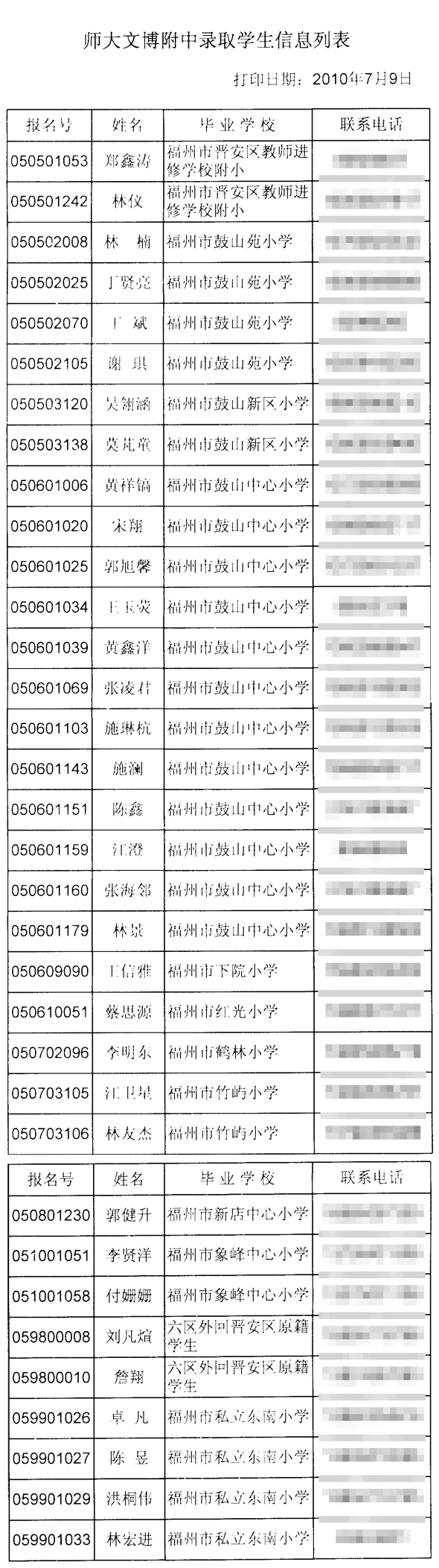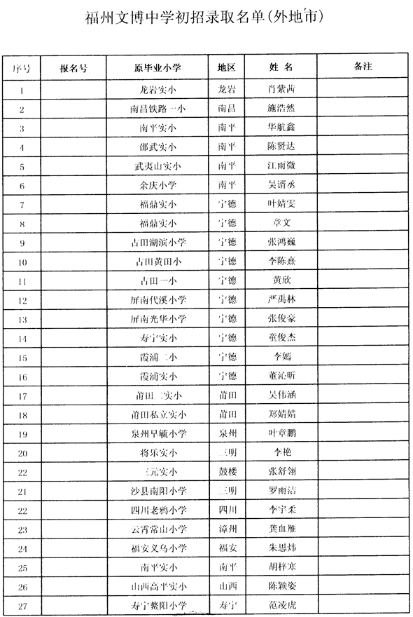 文博中学2010秋季初一新生名单,经福州市教育局批准,现予公布。
