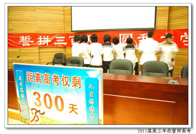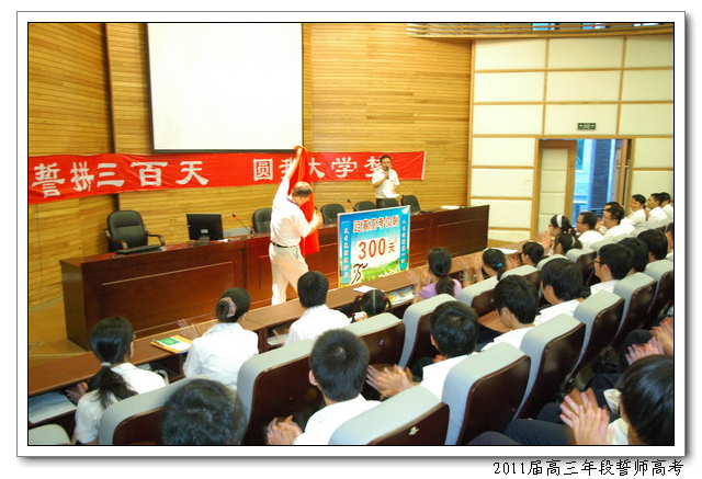 8月12日,下午4:50,会议中心二楼,2011届高三年段全体师生举行主题为“誓拼三百天,圆我大学梦”的誓师高考活动。俞继圣校长、林仰仙校长助理、及高三年段全体家长应邀到场。会上,文科学生代表曾槟同学、理科学生代表陈硕慈同学、家长代表依次发言。高三年段全体教师在全体在场的领导、家长、同学们面前庄严起誓,年段全体老师在未来的三百天里,将和全体同学一起,团结拼搏,努力奋斗,为延续学校在2009、2010年高考中创下的辉煌写下新的篇章。