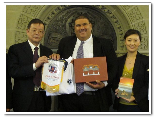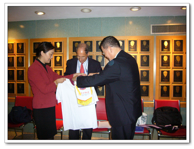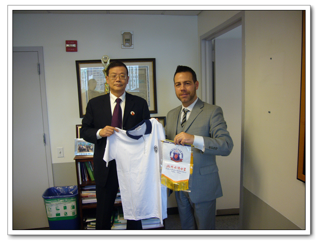 图5:向纽约市教育局赠送文博中学校旗和学生校服。