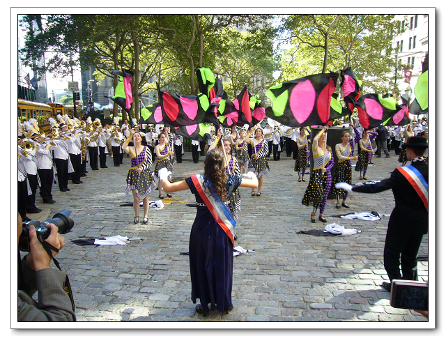 图2:纽约Tottenville 高中130多名学生管弦乐队为升旗仪式演奏中美两国国歌,并进行旗舞表演。