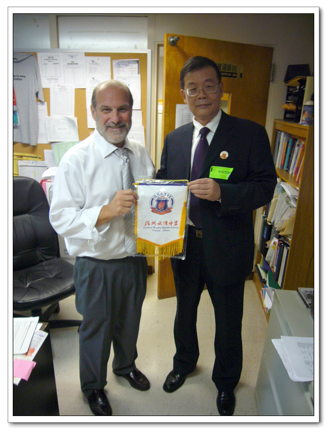 图8:访问John Bowne High School,向校长赠送文博校旗。