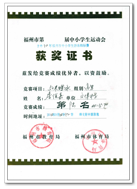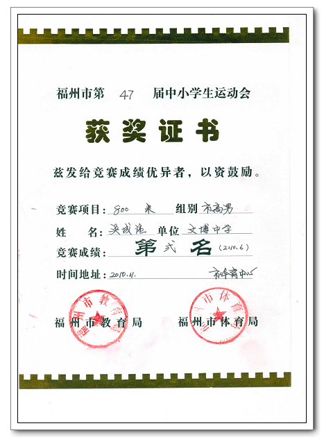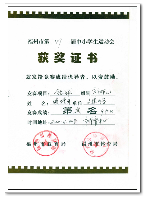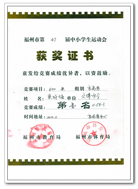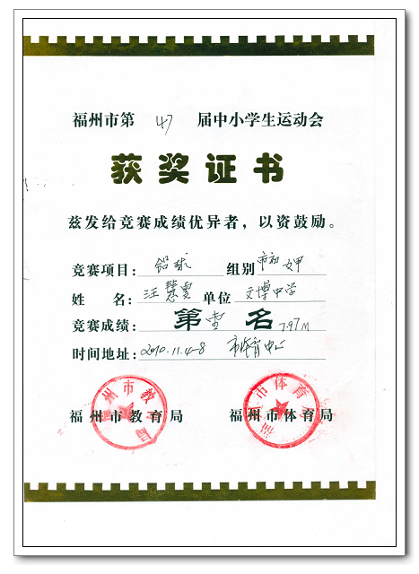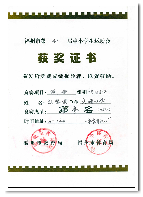 福州市第47届中小学生田径运动会于2010年11月4日开幕。一共有89支代表队近2000名选手将在为期5天的比赛中进行角逐。据了解,这是福州市有史以来规模最大的一届中小学生田径运动会。这是一次充分展示各个学校实施素质教育的成果的盛会,也是展现我校在抓好教育教学质量的同时,其余各条战线齐开花的盛会。在这次运动会上,我校运动健儿充分发挥顽强拼搏的精神,取得佳绩,为学校争得荣誉,学校向他们表示祝贺。具体获奖情况如下:
