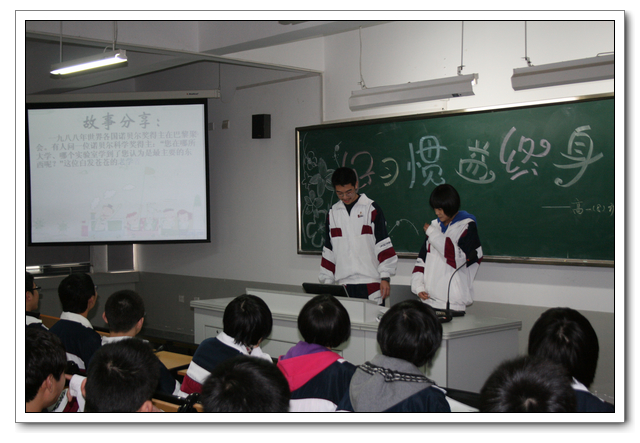 承办班级的同学积极参与,从节目筹划、课件制作、节目排练、主持表演,都一丝不苟。虽然有的同学是第一次上台表演或主持,有的节目还不很成熟,但同学们积极努力的场景让人难以忘怀。初二(3)班的情景剧、初一(5)班的故事会、高一(8)班的书法表演、高二(2)班的主持人串场……一个个精彩纷呈,启人心智。