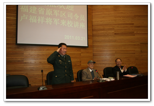 为了更好地开展“迎接建党90周年”和“纪念辛亥革命100周年”系列活动,3月21日下午,学校聘请福建省原军区司令员卢福祥将军,亲临我校讲述自己革命战争的亲身经历和身边战斗英雄事迹,进行爱国主义和革命英雄主义教育。党员教师,入党积极分子,团委、学生会干部,初一、二年各班委、少先队干部,高一、二年各班委、团支部干部等200多人到场聆听。