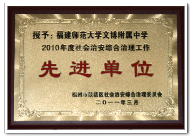 近日,经福州市洪山镇综治办、国光社区居委会联合推荐,福州市鼓楼区社会治安综合治理委员会授予福州文博中学“2010年度社会治安综合治理先进单位”称号。