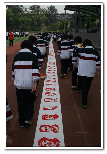 第五届校园艺术节,美术组在学校德育处的配合下,完成了班班有美展的活动,上周,我们利用课间操的时间,向全校师生展示了课堂上精心制作的剪纸样品。初一年段的《水浒人物》50米长卷、高一年段的《主席在我心中》15米长卷和高一年段的主席像剪纸将参加福州市庆祝建党90周年师生作品展。
