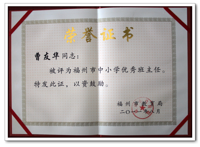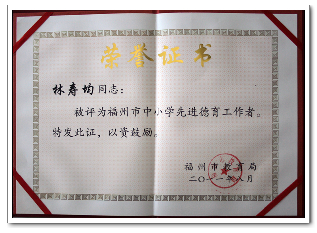 在福州市教育局开展的“2011中小学先进德育工作者、优秀班主任评选活动”中,我校林寿均老师荣获“先进德育工作者”称号。卢人立、曹友华2位老师荣获“优秀班主任”称号。