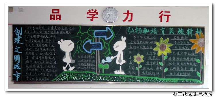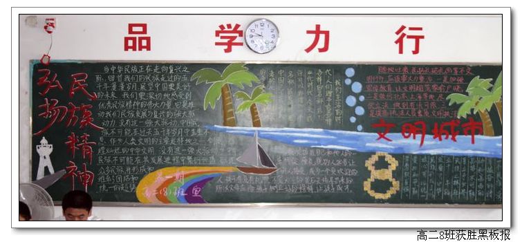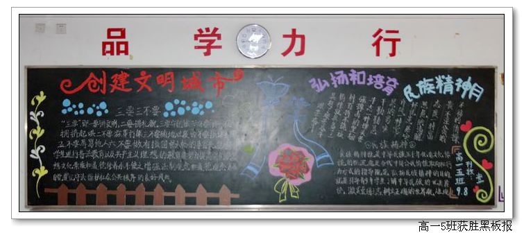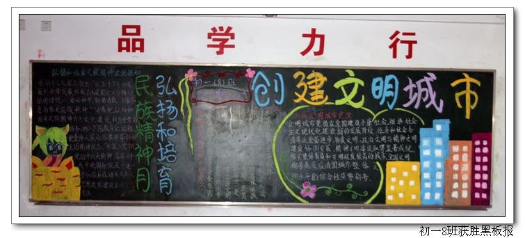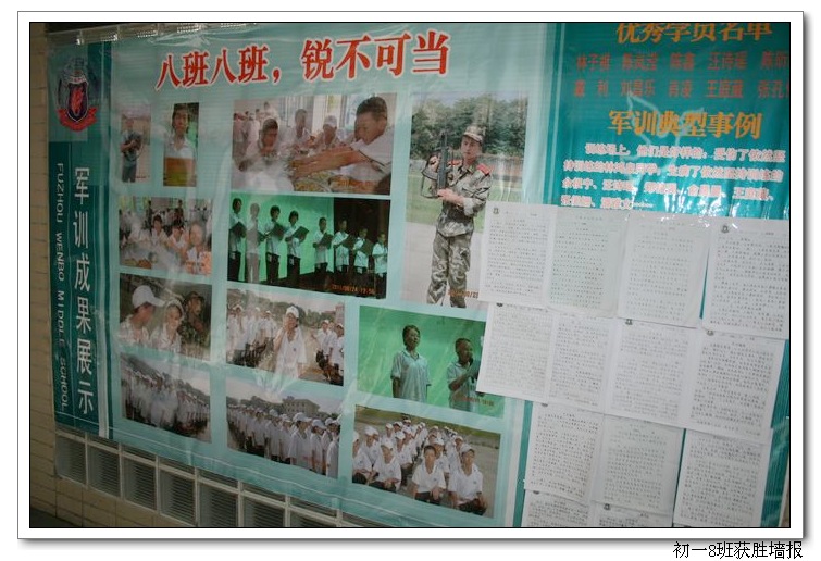 今年9月是全国第八个“中小学弘扬和培育民族精神月”;恰逢福州市迎来全国文明城市检查。我校以此为主题,并结合期初学生的军训和社会实践,举办了此次墙报和黑板报的展出与评比活动。活动得到所有班级的积极响应,同学们在班主任的指导下,精心设计与认真制作,一个个主题鲜明、版面精美的墙报与黑板报,展示在了师生面前。