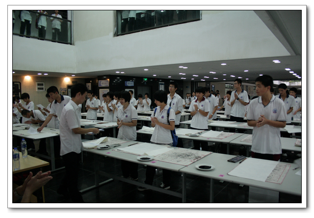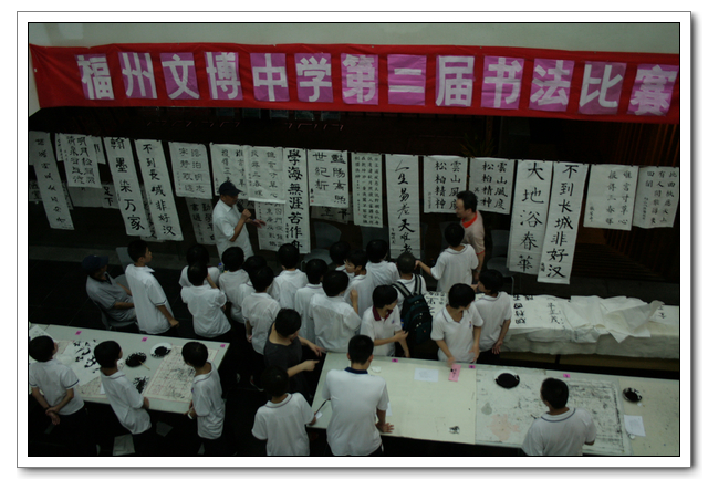 本次比赛,“硬笔书法”分为初中组和高中组全员选拔,参加决赛共有106人;“毛笔书法”不分年级,共有58人参加现场比赛。此次现场“毛笔书法比赛”有幸邀请了:黄信贤老师(福州教育学院美术科主任)、祝玉景老师(中国书画研究院院士,福建书法家协会会员)、林斌老师(中国书画协会理事)做评委,评委们认真审看学生的书法作品,经评委们认真评议,最终评出了一等奖2名、二等奖4名、三等奖6名、优秀奖6名。比赛结束后几位老师和同学们共同交流学习毛笔书法的经验与心得,并现场书写画作,供老师和同学们共同欣赏与学习。