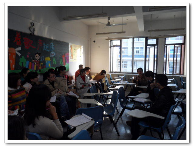 11月21日下午第二节,公开课在音乐教室(一)如期进行。来自市区、各县听课的音乐教师达一百多人,由于空间有限,许多老师只能站在走廊听课,让我们颇为感动。公开课课堂气氛融洽,学生配合默契,从演唱到欣赏,从回答到互动,都能够很顺利的进行,授课教师合理的安排好课堂秩序,有效的使用教学方式调动课堂气氛,达到良好的教学效果。