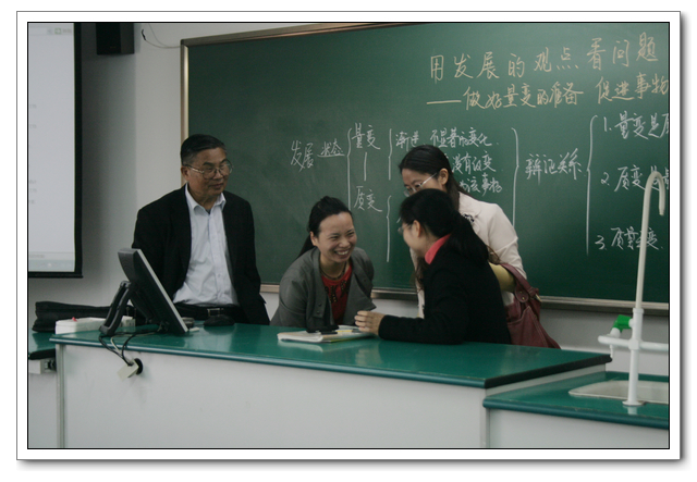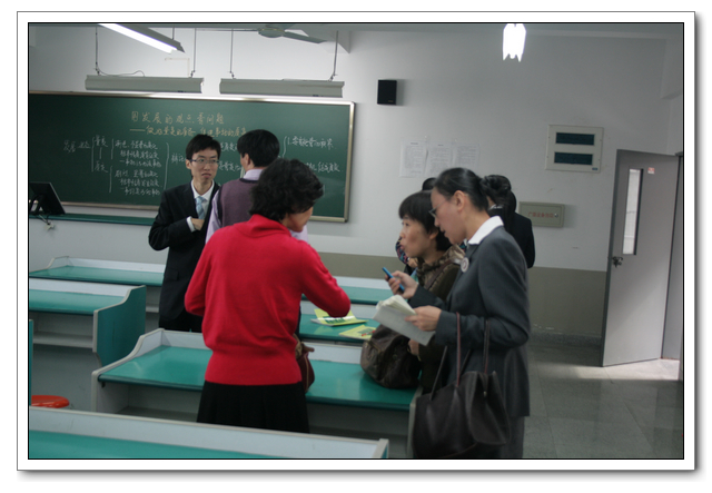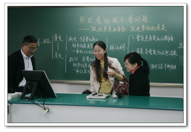 连玮老师公开课的课题是《做好量的积累,促成事物的质变》,课堂展示的是“情景导学,联系生活,自主探究”教学模式在我校政治课堂上的个性化操作。连老师善于创设情景、运用实例,设计问题引导学生掌握量变和质变的概念,课堂通过举一反三让学生联系生活,并举例检测学生的学习效果。设计课堂训练,引导学生自主探究,体现学生主体,鼓励个性化成长,用激情点燃激情,让老师们领略了我校师生的风采。贯彻课堂始终的有效学法指导,也让人印象深刻。本节课准确完成课标规定的教学要求,激发了学生的学习热情,既达到了传授知识的目的,也收到了教会学生学习的效果,诠释了高中政治课堂的有效性。情感、态度、价值观教育隐藏在教学过程中也有独到之处。课后评议在市教院教研员张健老师和学科中心组成员何菁老师的共同组织下有序进行。老师们探讨热烈,肯定了开课老师功底扎实,课堂富有激情,环节设计清晰有条理,板书合理实用,生生互动精彩、时政事例典型贴切,课堂训练有效、及时、多样。同行们提出的改进建议让我们深受启发。市学科中心组成员何菁老师的总评独到又有前瞻性,毫无保留地为我们指点了迷津。