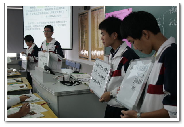 邓金秀老师开设的《理智面对学习压力》,向到场观摩的老师们展示了“情—导—探—评”教学模式在我校政治课堂的个性化操作。邓老师从学生中挖掘情景,引导学生学会全面、辩证看待学习压力,设计生生辩论活动,探究学习压力的双刃剑作用。老师恰到好处的点评和小结有效地帮助学生准确认识学习压力,找到应对的策略。本节课准确到位地理解了课标意图,真切地为此时面对升学、理想、家人和老师多重压力的初三学生提供了帮助,也为他们将来要面对的压力提供了方法指导,有利于学生当前和终生发展,充分体现了初中思品课的价值。教学触发了老师们的思维碰撞,引发了较多探讨。老师们充分肯定了开课教师基本功扎实,课堂设计合理又大胆,板书设计条理清晰、实用、有创意,整合教学资源的意识非常强,教学模式有可借鉴之处。同时也提出了一些建议,如加入心理学小活动,当堂帮助学生释放压力。老师们也就“如何让更多的学生参与课堂”等问题进行了探讨。市教院教研员林颖老师事后说,这样的碰撞和学术探讨氛围让人激动,非常有价值。