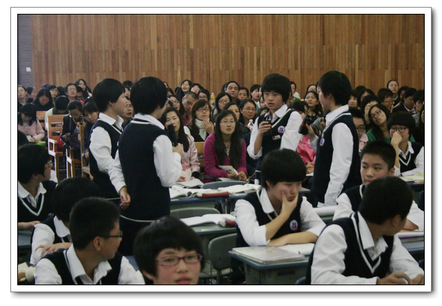 两位教师在课堂教学中或行云流水,或激情洋溢,课堂表现当真说得上是风生水起,精彩纷呈。她们以稳健的驾驭课堂的风格,敏锐的课堂应变技巧,精巧鲜活的情景创设,简洁明了的课堂用语暗示,丝丝入扣的预设,快节奏高密度的语言交际训练,充分诠释了我校首次市级开放周“优化设计,讲练结合”的主题涵义。两节风格迥异但同样精彩的公开课诠释了开课老师对英语教学深刻的理解与思考。