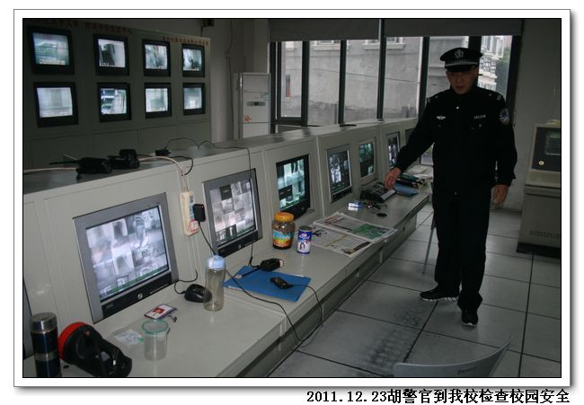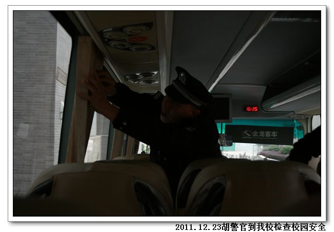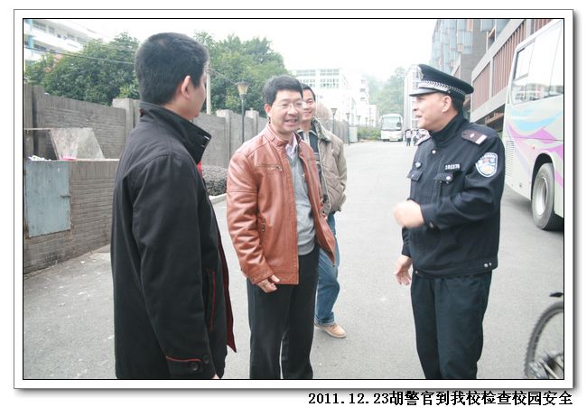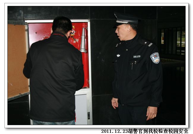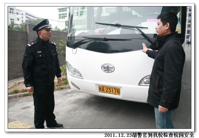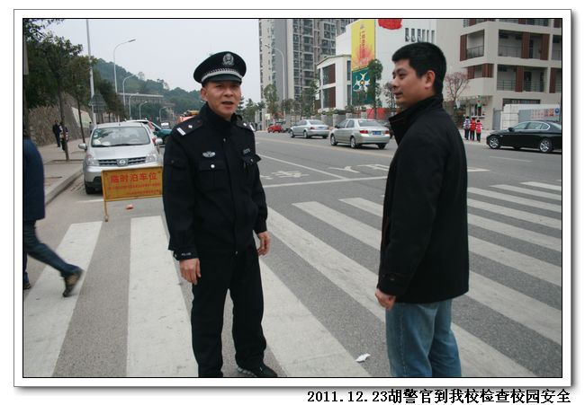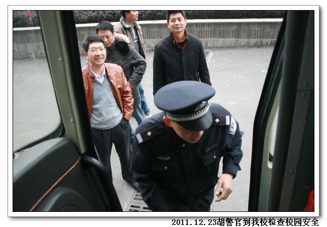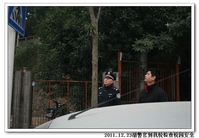 2011年12月23日下午,校法制辅导员、洪山派出所胡丛荣警官在周副校长、德育处吴燕红副主任的陪同下。检查了学校的校车安全、消防设施、校门口及周边的安全情况。
