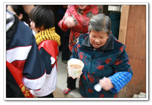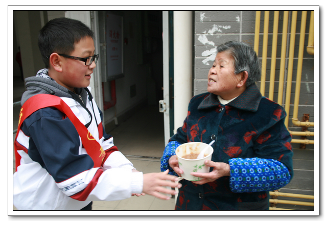 听说我们来了,老人们聚了过来。给每人送上一碗热腾腾的拗九粥,老人们边吃边笑。张伊姆见了我们乐呵呵地说,“你们这个活动办得好啊,体现了孩子们的爱心。” 俞阿婆比划着说:“我已经几年没有吃过拗九粥了。”看到我们给她送拗九粥,她不停笑着点头。老人家回忆说,以前“拗九节”都会给父母送上一碗拗九粥,那时买不起好的材料,粥里只能放些红枣桂圆表示一下,但父母吃起来特别感动。“现在生活条件好了,但做拗九粥的人却越来越少,很可惜。”