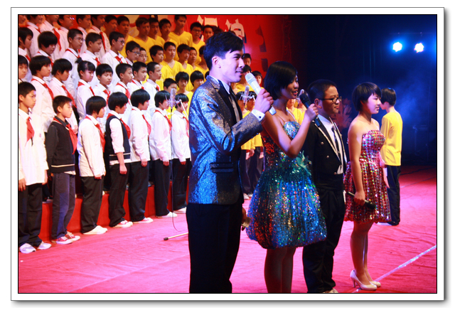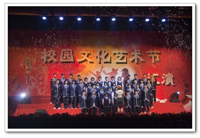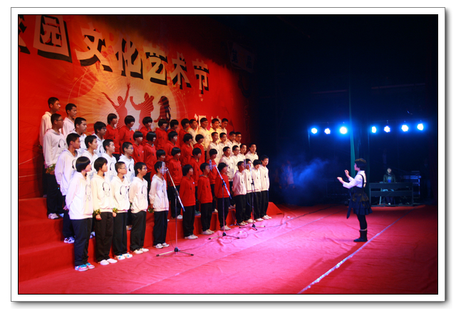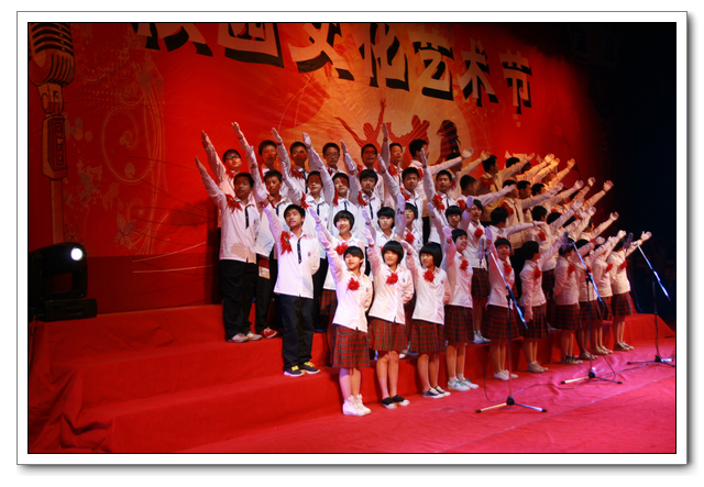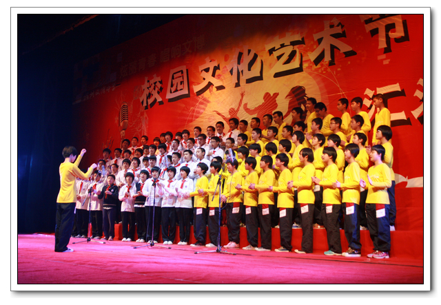 晚会由初一年段汪诗瑶、熊思喆,高三年段吴煌 、高二年段陈思羽四位同学主持。初一年段大合唱《新世纪的新一代》开启了合唱篇章,初一(1)班的《精忠报国》慷慨飞扬,初一(8)班《我仰望五星红旗》一片赤诚,初二(5)班《打靶归来》歌声嘹亮,初二(8)班《校园的早晨》气息清新高一(2)班《再见,小时候》满怀成长的渴望,高一(7)班《天使》张开梦想的翅膀,高二(5)班《北京东路的日子》声部和谐,高二(2)班《我的舞台》展示高二学生充分的自信和从容。