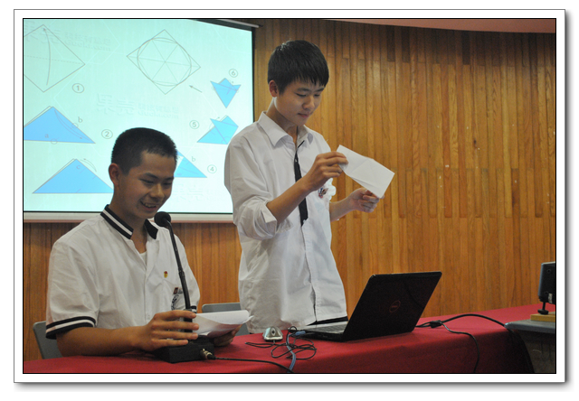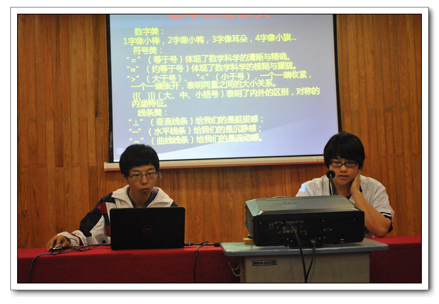 2012年5月10日数学组“教研月”活动之一 ——高一年段学生围绕主题“传播数学文化美”的课件制作比赛如期举行,高一年段以班级为单位,向我们展示了“数学上的不规则美”、“黄金分割比例”、“分形几何美”、“数学发展史的美”、“建筑对称”、“折纸中的数学”、“建筑美”等等,内容丰富多彩,让同学们更深刻地体会到数学在各个领域的美。最终高一(6)班“建筑美”获得了一等奖,高一(3)班的“折纸中的数学”与高一(4)班的“黄金分割比例”获得了二等奖。