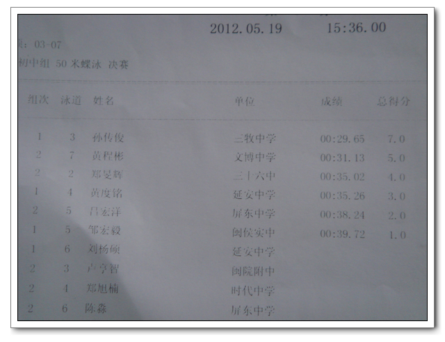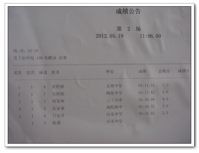 我校八年级黄程彬同学于5月12日参加在漳州举行的“2012福建省少儿游泳冠军赛”分别以29秒04,1分04秒55,获得男子少年乙组50米、100米自由游泳两项第三名。5月19日参加“2012年福州市中学生游泳锦标赛”时以1分11秒31,31秒13,获初中男子组100米蝶泳第一名、50米蝶泳第二名,以上四项成绩均达国家二级运动员水平。学校对黄程彬同学取得的优异成绩表示祝贺。