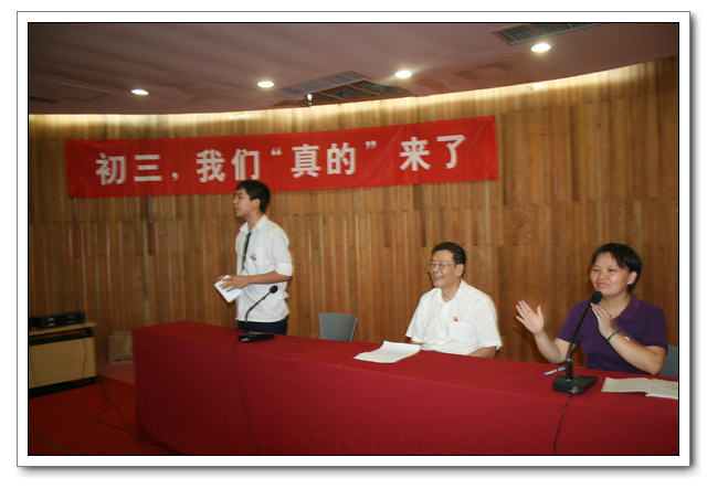 9月2日下午,我校2013届初三年段全体师生齐聚会议中心一楼,召开主题为“初三,我们真的来了”动员大会。会议由年段长主持,先阐明今天会议的主题,简明扼要鼓舞人心的讲话使同学们打起了十二分的精神。接下去,由各班代表上台发言,并宣读本班的“初三誓言”。同学们的誓言饱含决心与信念,八个班的冲刺口号虽然各不相同,但都是那么的响亮,震撼人心,每个同学都摩拳擦掌,准备迎接初三的挑战。最后,由敬爱的俞校长讲话,他给同学们提到了初三学习要“六要”——上课一定要做笔记、课后尽可能要多读书、前后知识要多联系、规范答题同时要提高速度、要能不断提出问题、要从帮助同学中获得灵感,使同学们受益匪浅。俞校长还鼓励同学们说从现在开始都不晚,增强同学们的信心。