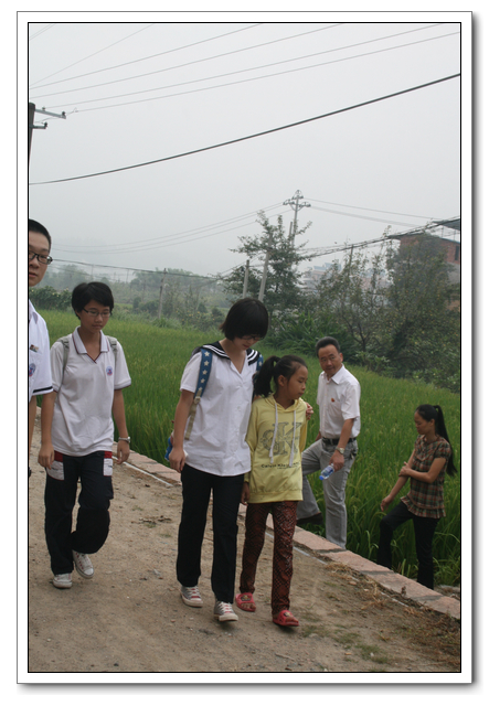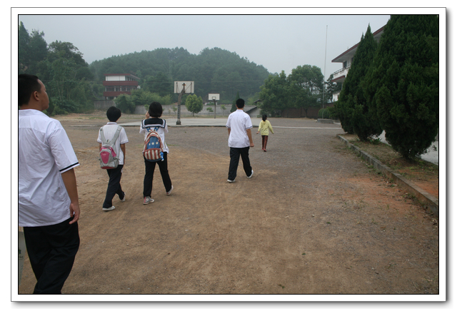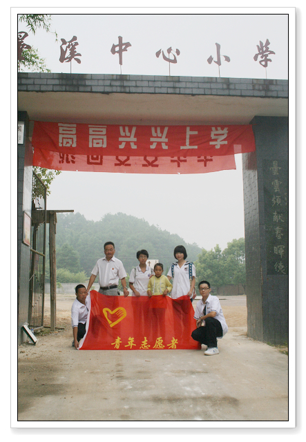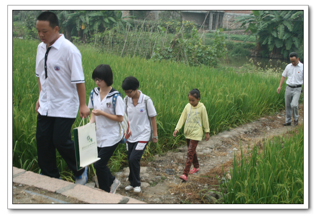 小焮一路上都不怎么和我们聊天,似乎很怕生,对她的问话也是回答得很简短。走了大概10分钟的路程,就到了昙溪中心小学的门口,小学里只有简陋的仅三层高的小楼,地面上坑坑洼洼的泥里面还掺着雨水留下的痕迹,一不小心就会踩到一脚的黄泥。在小焮的带领下,我们来到她的班级的门口,看到教室里面凹凸不平的课桌椅,想到小黄焮每天就要在这样的环境下学习,心里头便忍不住的心疼。我们在小学的门口和小焮合了影,心酸之余也向他承诺以后有机会还会去看她的!换一种方式去感受别人和我们不一样的生活,不再只是单纯在网络上、报纸上了解他们,切身实际地体会到他们艰苦生活的感受,能够给我这次机会帮助他们,献出我的一份爱心。我们应当多开展各种活动,多去帮助这些生活困难的人们,虽然不能直接给他们一些什么,但可以尽我们的微薄之力,让她们感受到有很多像我们这样的人在关注着他们。