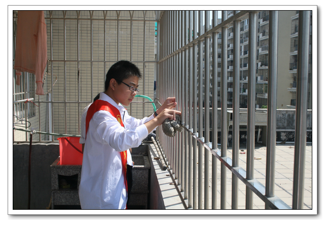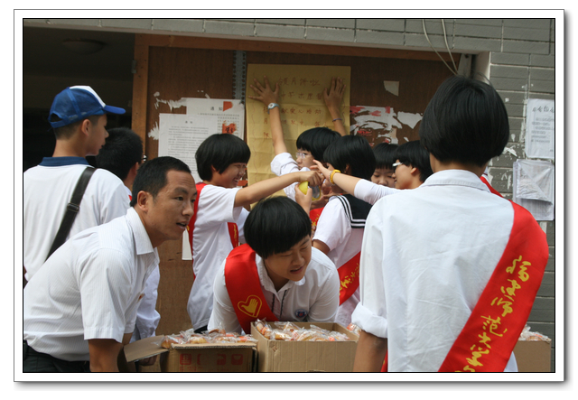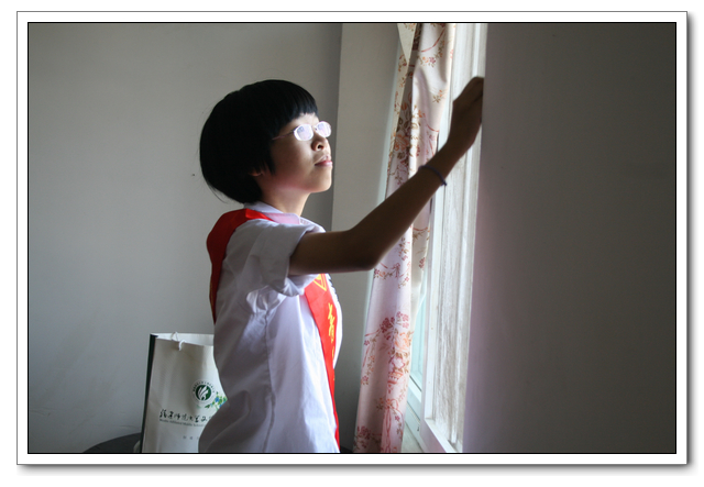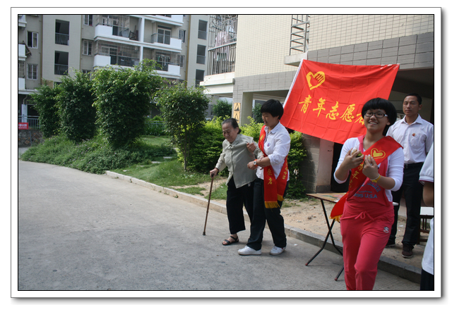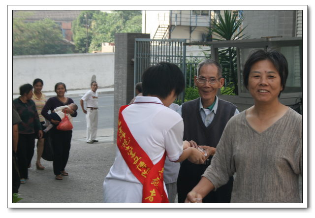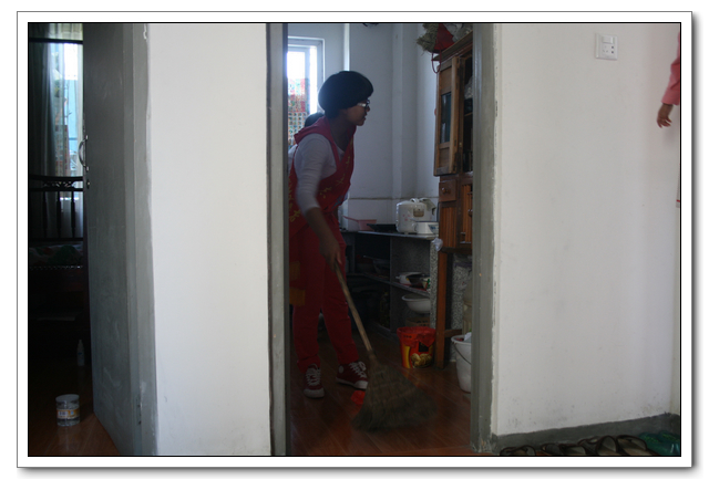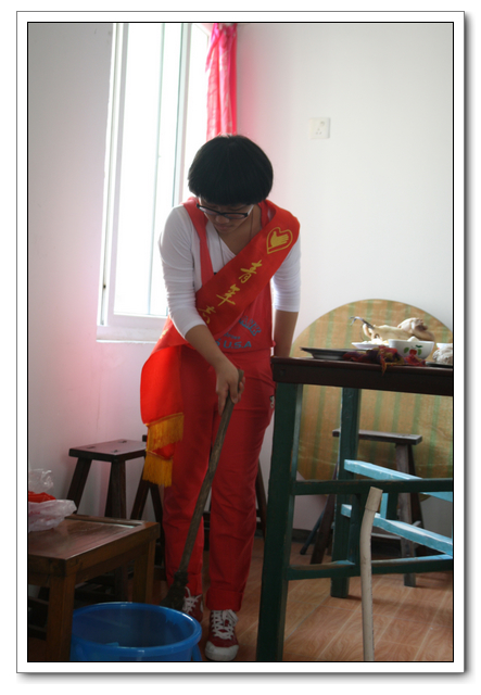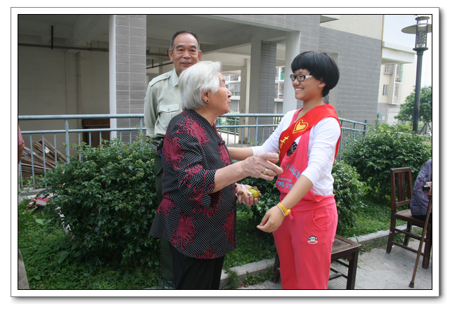 10点的时候,我们分完了月饼,分成两组,到孤寡老人家中,为他们送去我们的祝福。我所去的是一位看起来年纪有七八十岁的老奶奶家,这位老奶奶背驼得厉害,看上去黑瘦黑瘦的,一副弱不禁风的样子。听说我们要来,老奶奶颤颤巍巍地下楼来迎接我们。看着她艰难上楼的背影,我真有上去扶她一把的欲望。老人家不大,约六七十平方米的两室一厅。因为是政府的安置房,也挺整洁。只是家具极少,客厅只有两把椅子、一张小桌、一台老电视,卧室也只有一张床和一个衣柜,很有点家徒四壁的味道。校青年志愿者协会会长何扬代表我们向老人送上中秋月饼和祝福,随后我们就热火朝天地做起了卫生。奶奶坐在椅子上看着,不时来关照关照我们,用福州话夹杂着普通话交代一些诸如抹布在什么地方之类的事。我一边擦着玻璃门一边笑嘻嘻地冲她扬了扬学校自备的抹布算是回答。我在擦卧室门框的时候,坐在我旁边的奶奶突然对我说什么,我凑上去听,她用福州话加普通话加比划,大意是说让我给她儿子打电话叫他回来。我一时愣在那里不知该怎么回答。林叔飚主任见状赶紧上来解围。