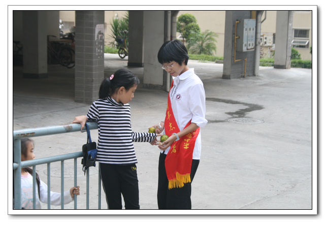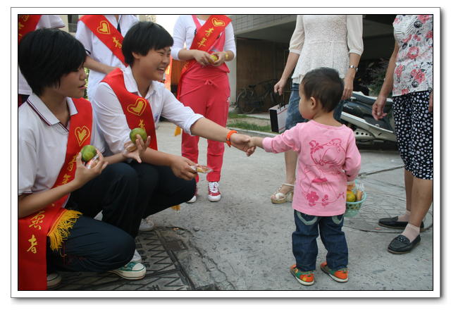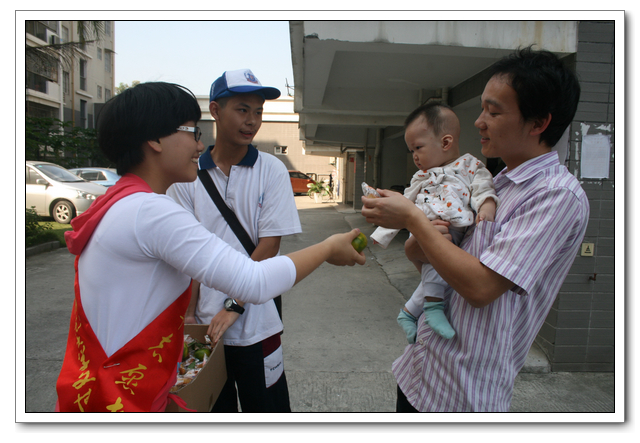 早上8:30,我们从学校出发,到达了国光社区的大儒世家四期小区。一到那里,我们就在楼底食杂店摆起了摊位,摆出我们带来的几大箱的月饼和桔子。随后我们兵分三路,几名同学留在摊点向过往居民分发橘子和月饼,另外两组同学一组拎一大纸箱橘子月饼,在小区打起了“游击战”,碰到老人小孩,就上前发月饼,并祝他们中秋节快乐。分到月饼的爷爷奶奶们都开心地感谢我们,小宝宝们也会在父母们的引导下伊伊呀呀地向我们说谢谢。这让我们很有一种满足感。