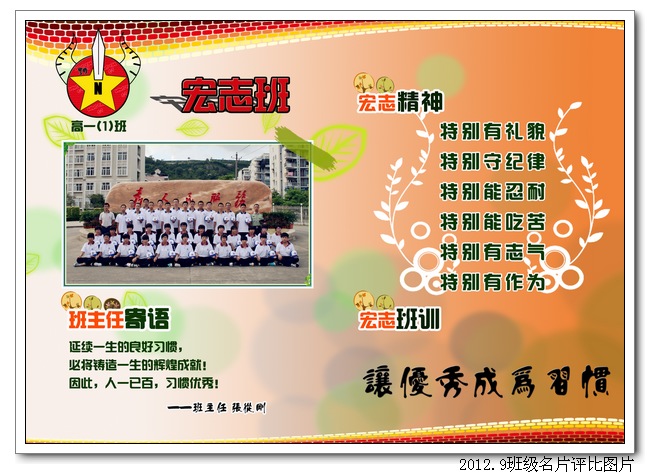 3、班级名片设计。新学年根据《福建省中小学校园文化建设评估暂行标准(试行)的通知》精神,我校组织开展了“班级名片设计评比活动”。活动得到了广大师生的积极响应,大家集思广益,制作出一幅幅精美的、有丰富内涵的作品。
