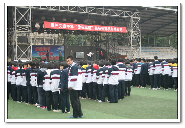 为全面贯彻落实《中共中央国务院关于加强青少年体育增强青少年体质的意见》精神,广泛开展全国亿万学生阳光体育运动。12月20日上午9:30,在校长的指导下,教务处、德育处、年段长班主任、体育组的组织下,由校中层以上领导的带领全校学生开展阳光体育“爱我福建·象征性环闽冬季长跑”开跑仪式正式启动。