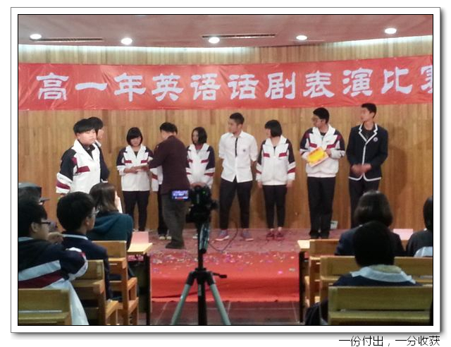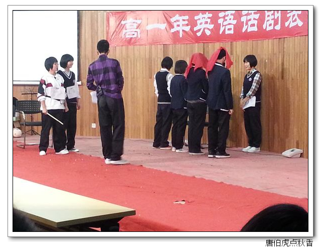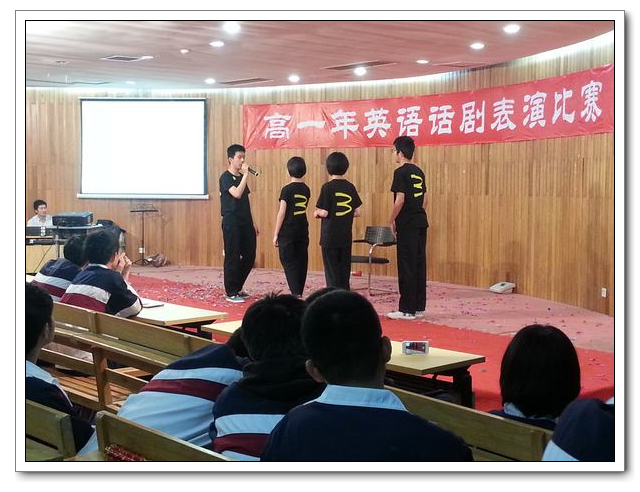 2013年3月29日高一年段英语组组织年段同学们进行了英语话剧比赛。英语话剧表演有着悠久的历史,它给我们的校园生活增添了不少的乐趣,同时它也有助于提高学生英语口语水平,锻炼胆量,极大地激发大家学习英语的兴趣。本次比赛共有八个班参加,每个参赛班级都为了本次的比赛精心的排练,最终大家的付出与成果是成正比的,参赛队员在台上尽情地发挥,丰富的想象力一次次给同学带来不同的惊喜。一班的《唐白虎点秋香》、五班的《猪八戒之嘻哈穿越》、六班的《梁山伯与祝英台》、四班的《白雪公主》都新奇大胆,赢得一阵阵掌声,三班的《花木兰》、二班的《百万英镑》、七班的《麦琪的礼物、》八班的《迷失的杰玛》的经典剧本,带我们重温了历史的奇妙,这次异彩纷呈的比赛让同学们获益良多。