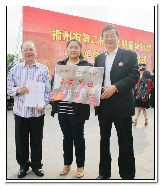 4月29日下午,由中共福州市委文明办、市直机关工委、福州市教育局、卫生局等多个部门联合组织的“文明餐桌行动示范单位”评选中,我校食堂荣获该项荣誉。