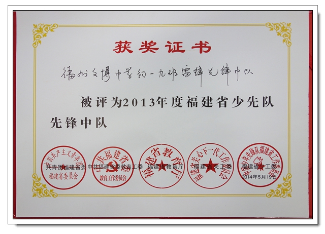 经学校团委少先队推荐, 我校2013级初一(9)班雷锋中队(班主任:俞敏珍)荣获2013年度“福建省优秀少先队先锋中队”荣誉称号。