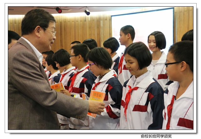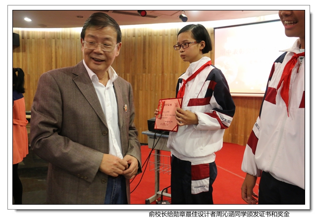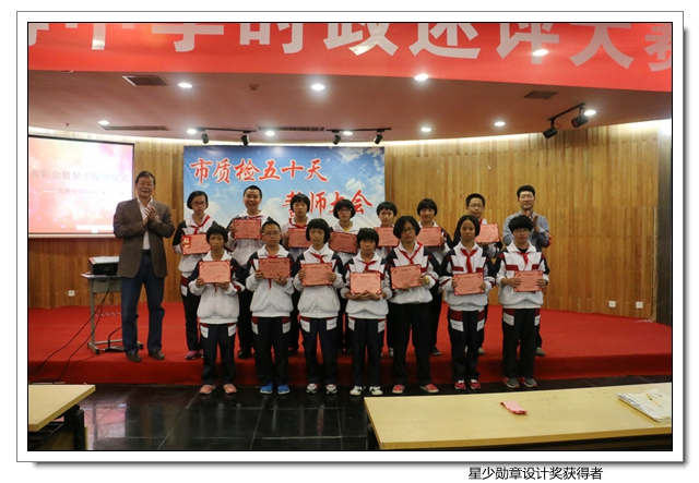 然后是庄严隆重授勋仪式。在授勋前,先颁发了“星级少年勋章”最佳设计奖(初一(4)班周沁涵)、最佳创意奖(初一(2)班戴陈炜)、十名最佳入围奖,学校领导给他们颁发了获奖证书和奖金。