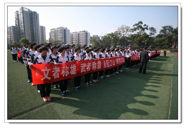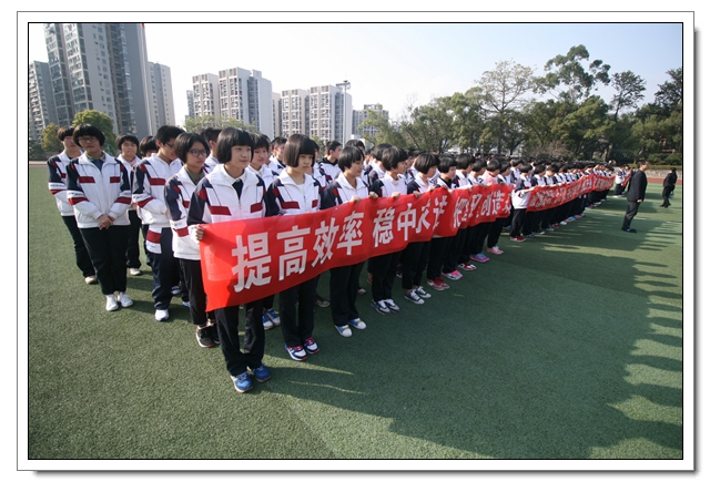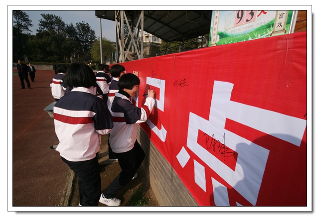 在主持人的指挥下,各班同学们都嘹亮地喊出了自己的口号,以此显示同学们面对百日后中考的决心。俞校长在场致辞,带领同学们共同向中考冲刺。之后,初三年段的全体老师在陈彪老师的带领下喊出了他们的誓言。接下来,年段领誓人也在台上带领四百位同学共同庄严宣誓,展现了初三年段斗志昂扬的风貌。俞校长和周圣段长一起揭开了中考百日倒计时牌的帷幕。俞校长还代表学校向全体同学赠送了寄托着期望的书签,以此激励同学们。大会临近尾声,初三年段全体的教职工和同学们争先恐后地到台前的横幅上签名,留下了自己的印记。希望2015届初三能以这样的面貌为文博再创辉煌!