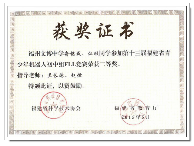 我校初二2班俞恺威、江顺同学于59-11日参加了在闽侯一中举行的福建省第十三届青少年机器人竞赛,荣获初中组FLL项目省二等奖,指导老师:兰长滨、赵燃。