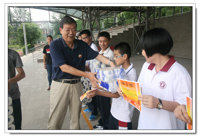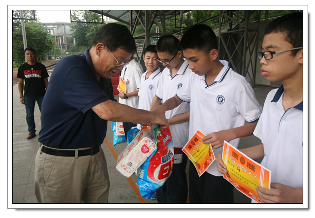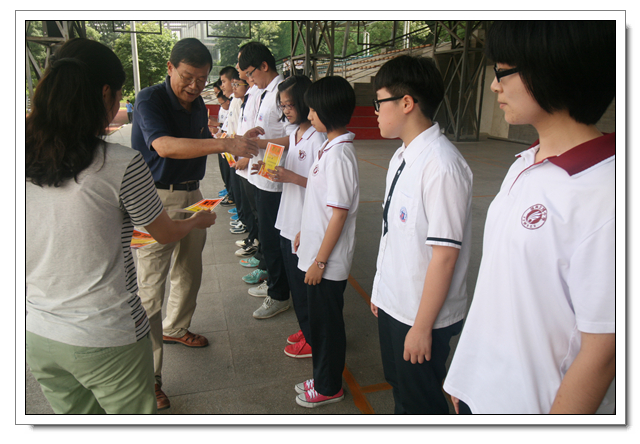 6月23日,课间操时间,俞继圣校长为获得星级宿舍称号的舍长颁发星级奖牌和奖品,学校也为星级宿舍的同学予以张榜表扬。